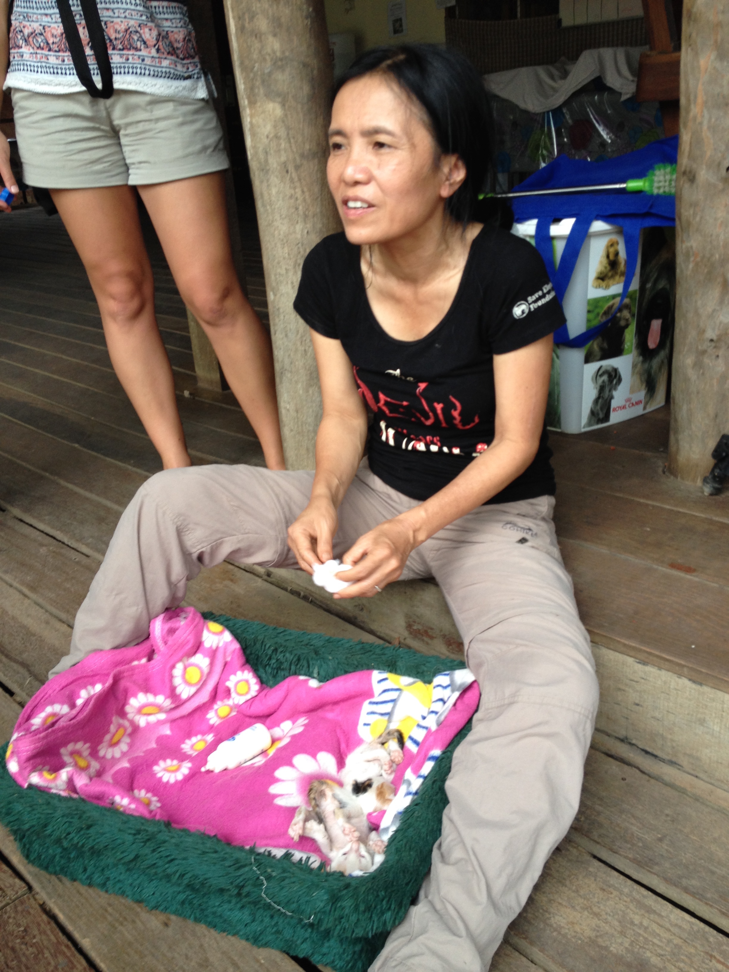 Meeting Lek for the first time – she was nursing two orphaned kittens that were found dumped in the creek