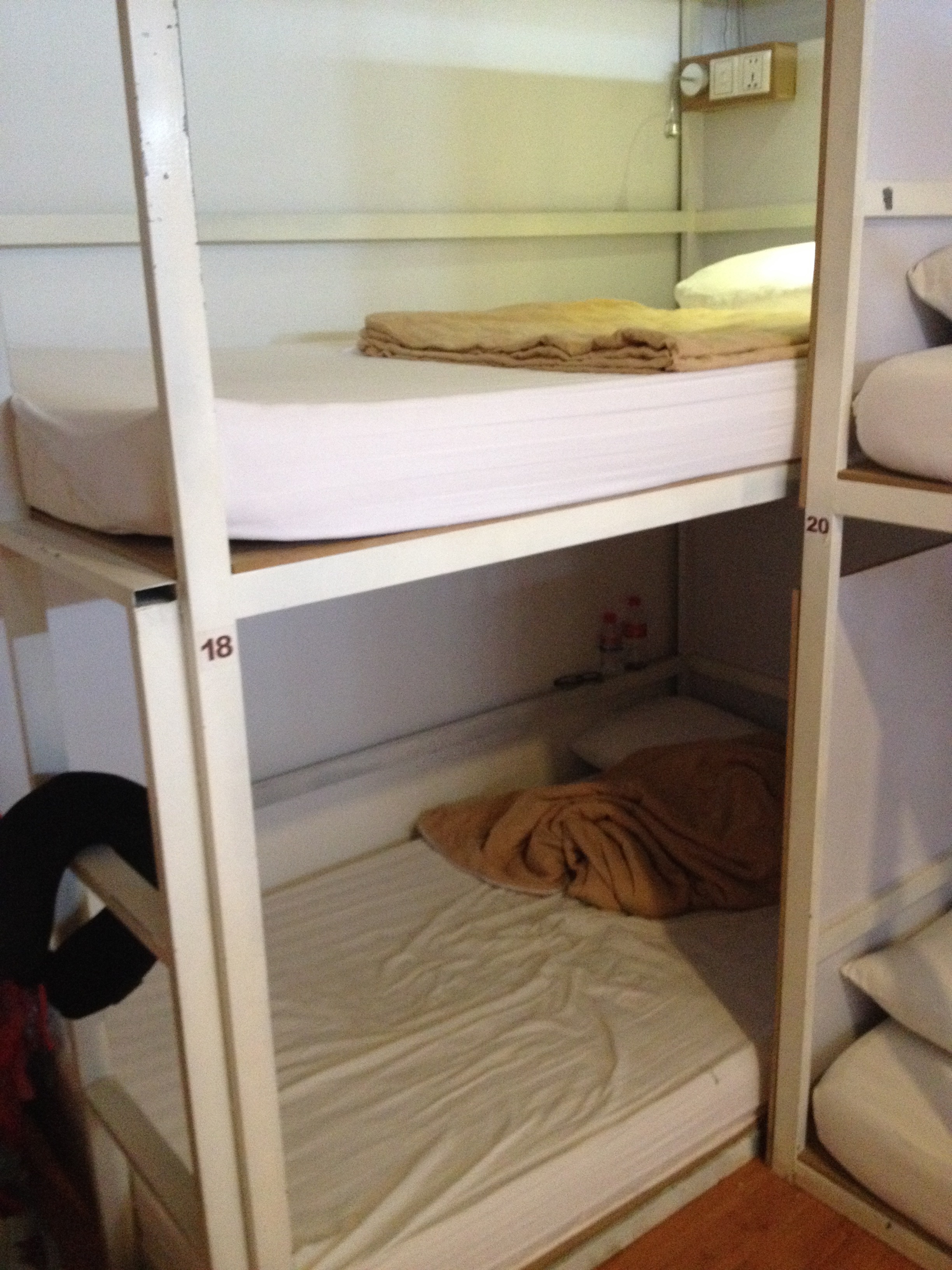 Pros: Free water, locker, and AC. Bathrooms were very clean, and showers included soap and shampoo. Hair dryers and towels also available with a deposit. Outlets, light, and shelf next to every bed. Large cupboard with lock. Good wifi connection. Bed was soft and comfortable, very nice pillow.