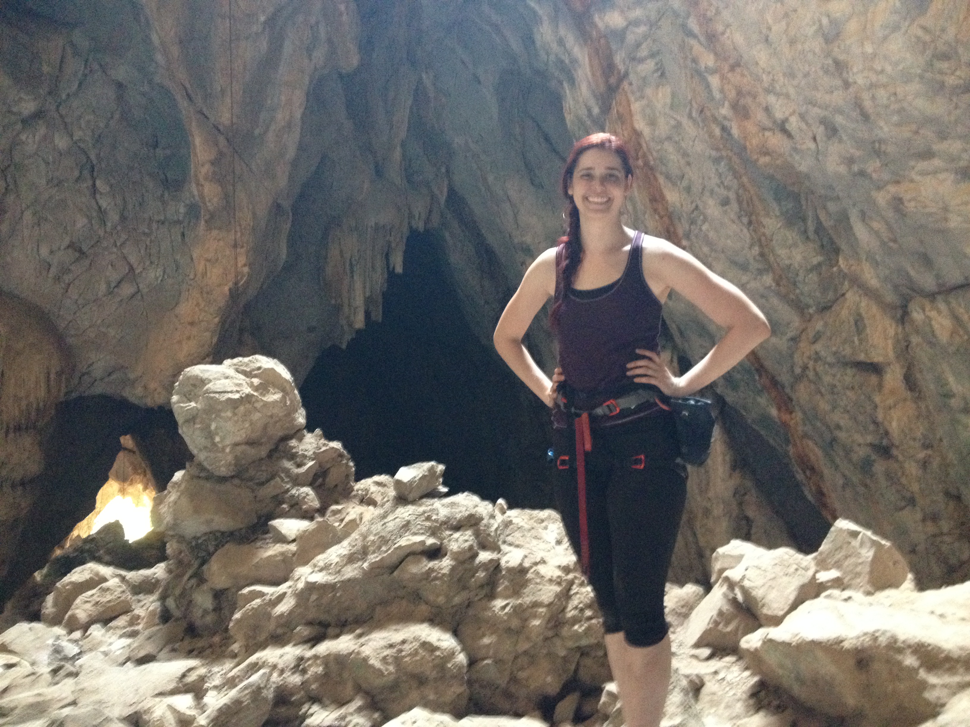 After lunch and another climb (this time relatively easy, but very high up – and I was still exhausted from the morning climbs) with a stunning view of the country, it was time to rappel down into the cave!! Cue me singing “Through the Mountain” from Floyd Collins.