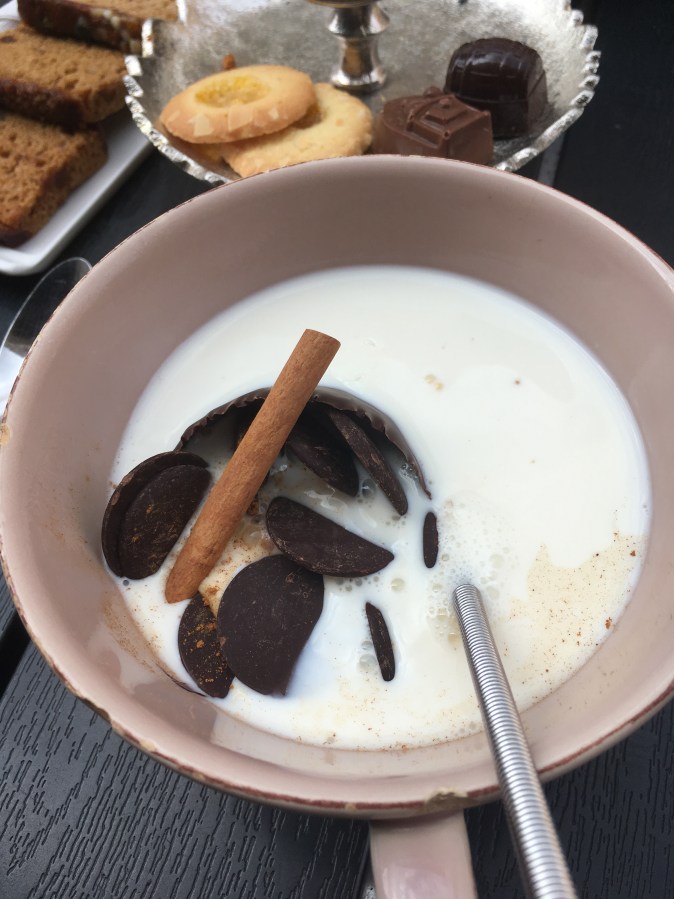 You dump your ingredients (chocolate cup and all) into the hot milk